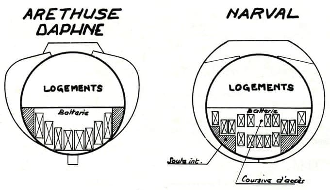 Les batteries sont un des points névralgiques d'un sous-marin. Elles emmagasinent l'énergie nécessaire pour le déplacement du submersible en plongée. Mais elles distribuent également l'énergie nécessaire aux appareils auxiliaires, l'électronique embarquée et l'éclairage du bord. Les accumulateurs sont répartis en deux groupes, un groupe AV et un groupe AR, situés chacun dans un compartiment différent. En cas de problème sur l'un ou l'autre des groupes, celui qui n'est pas touché permettra de maintenir le fonctionnement du sous-marin en marche réduite. Ces batteries sont, pour ce qui est des sous-marins type "Daphné", situés sous les compartiments des logements officiers et du C.O.1. On trouve également des soutes intérieures au niveau des compartiments batteries.