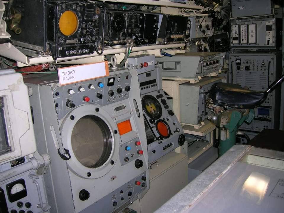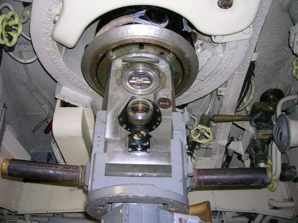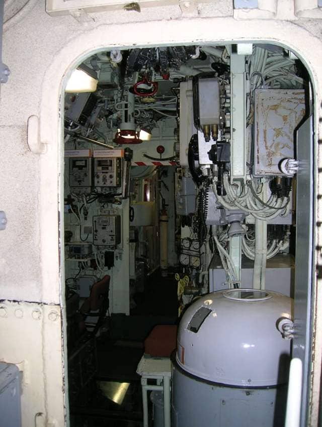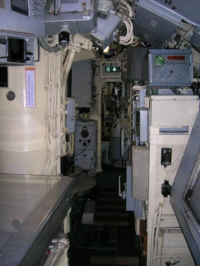 Vue sur tribord, le radar. On remarque le siège du périscope d'attaque.