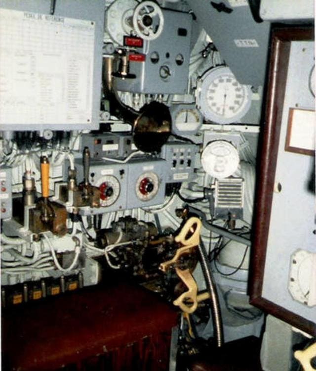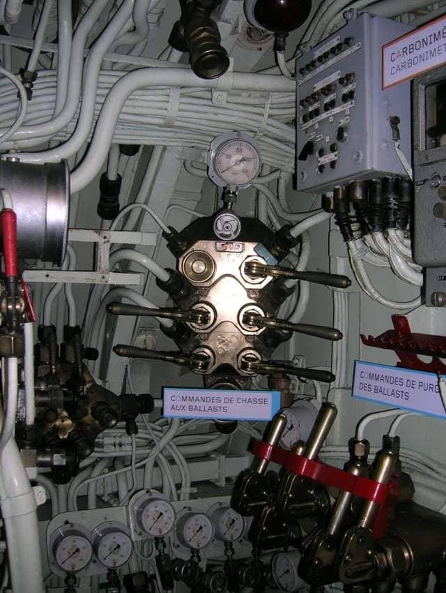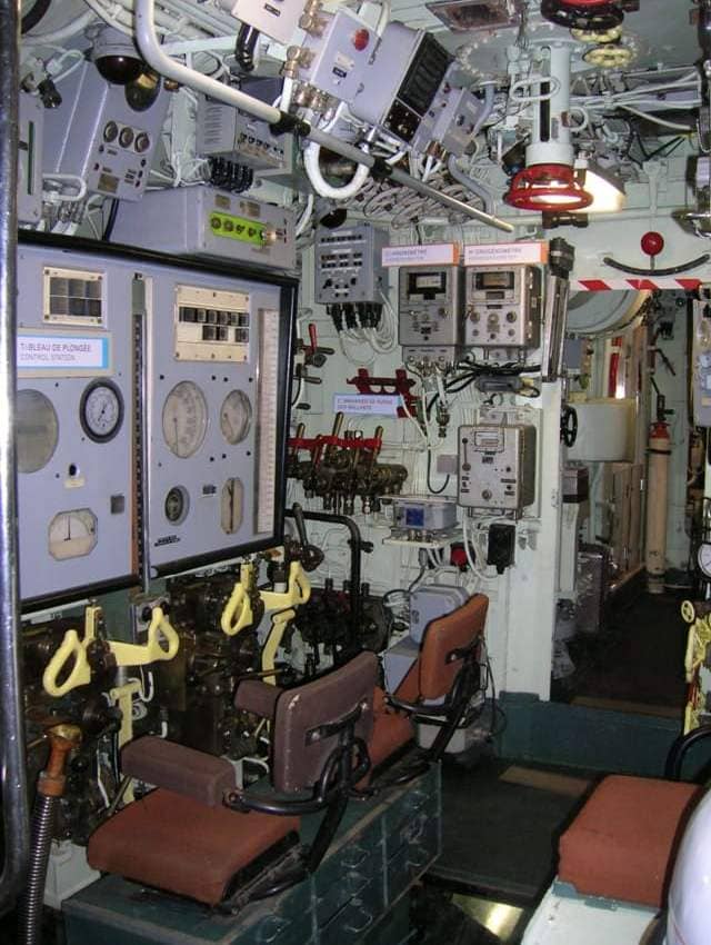 On peut distinguer sur cette vue les barres de plongée avant et arrière. Dans le fond On aperçoit l'Hydrogènomètre, l'Oxygènomètre et le carbonimètre pour éviter de s'envoyer en l'air et surveiller la qualité de l'air. Sur la droite de la photo, vue sur la tranche hygiène. Dans le fond à gauche, on distingue en partie les tableaux de plongée détaillés ci-dessous.