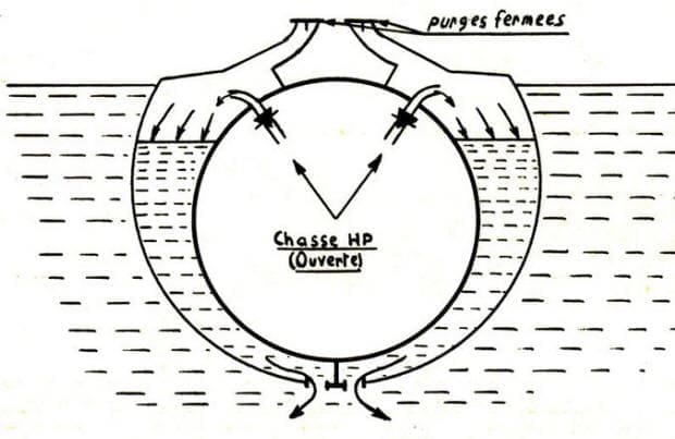 La chasse HP à grande immersion présente des inconvénients. L'expérience montre qu'un sous-marin remontant sans erre horizontale prend un mouvement oscillatoire transversal au delà d'une certaine vitesse ascensionnelle. Autrement dit, il remonte avec un mouvement de roulis qui va en s'amplifiant. Pour diminuer cet effet, il faut prendre le maximum de vitesse. En cas de voie d'eau importante, on chasse à pleine puissance sans trop se soucier de cet effet du à la flottabilité limite dangereuse. Des deux maux, on choisit le moindre... Reste à prier que nous atteignons la surface sans encombre, par exemple, un bâtiment de surface à l'aplomb du point de surface, ce qui vous l'avouerez serait le comble de la malchance... Mais dans ce cas, on ne choisit pas, on subit.