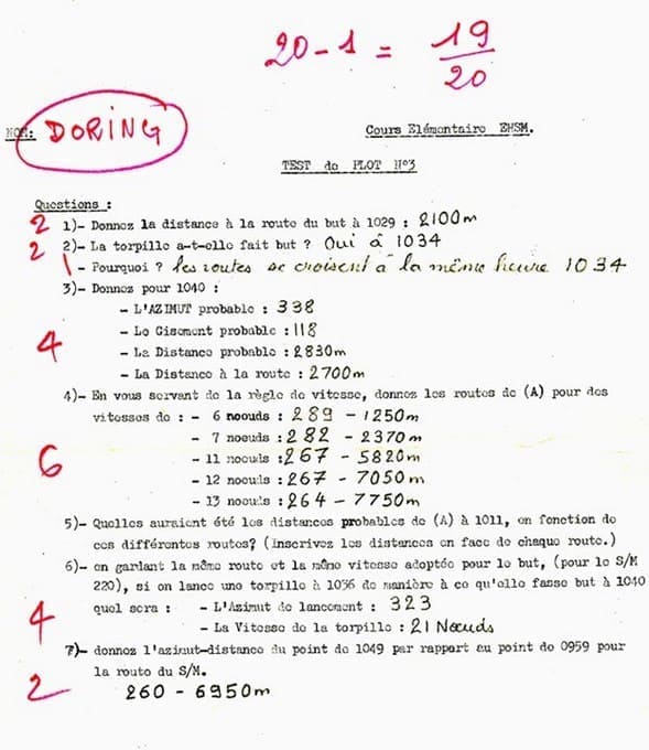 Ci-dessous un exercice retrouvé dans mes archives qui donne un aperçu des questions que pose un officier au traceur à la table de plot. A savoir que le traceur n'a pas la journée pour répondre. Les calculs doivent être rapide et précis. Attention cet exercice n'a aucun lien avec le calque et la fiche précédente. Pour le -1, ne cherchez pas, j'avais oublié de noter mon nom.