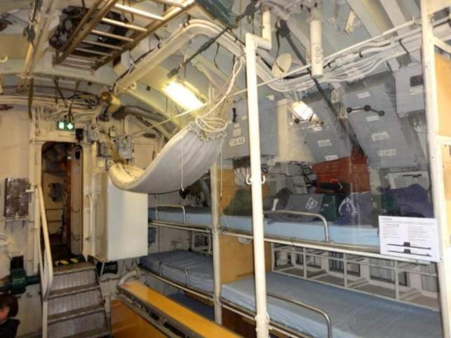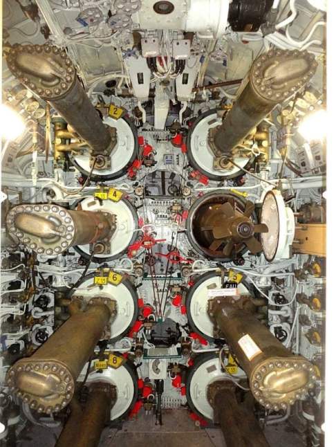 Sur cette dernière photo, le refouloir pneumatique du tube 3 a été enlevé pour ouvrir le tube. On aperçoit la torpille légèrement reculé et l'on distingue parfaitement les deux hélices contrarotatives qui empêchent la torpille de tourner sur elle-même en fonctionnement.