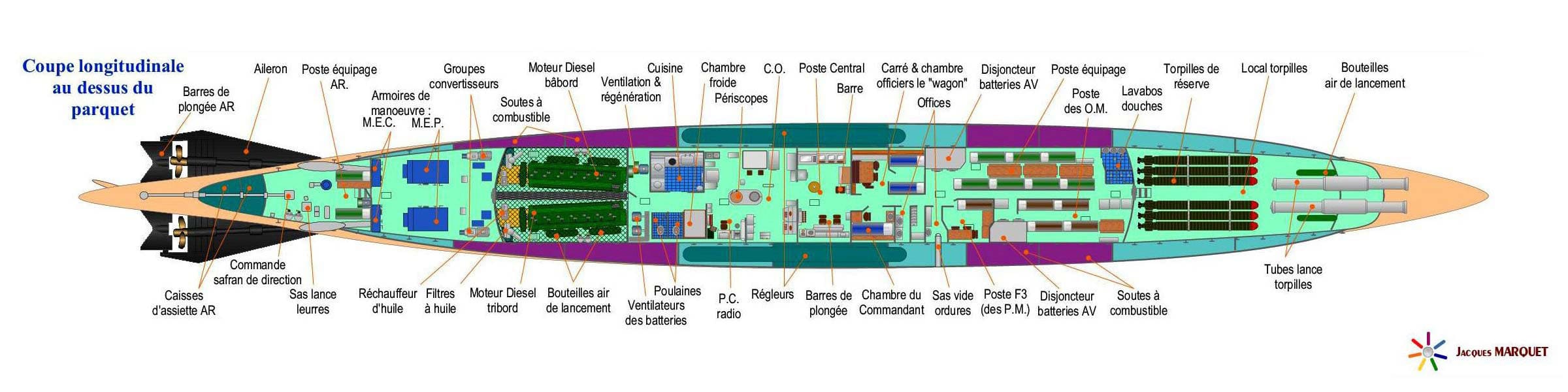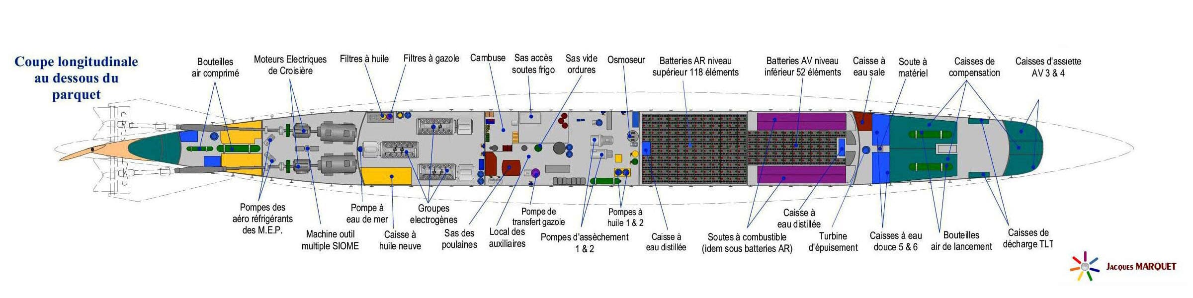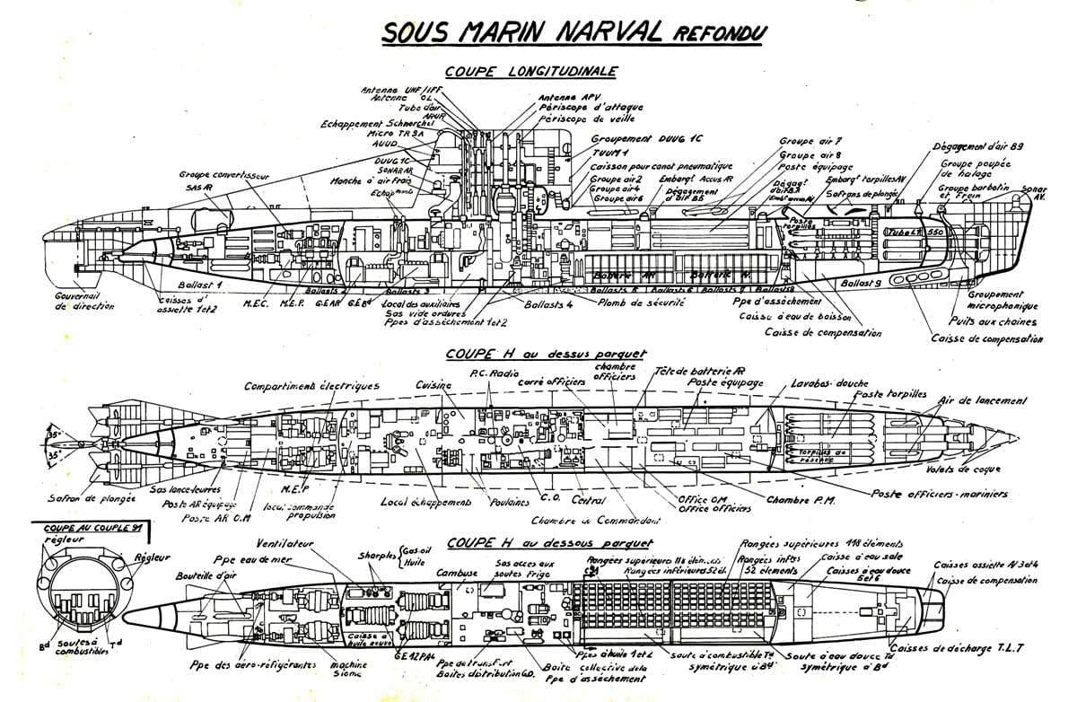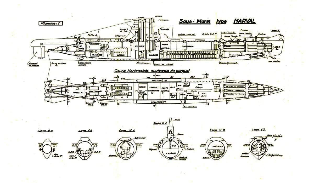 Je remercie Jacques MARQUET pour la réalisation de ces planches absolument remarquables de détails. Celles-ci facilitent grandement la compréhension de la constitution d'un sous-marin de type NARVAL.