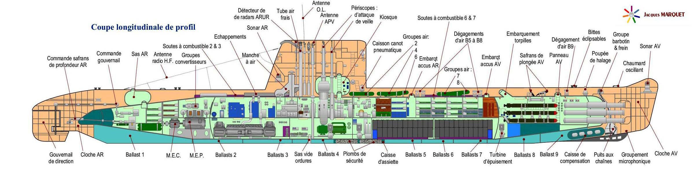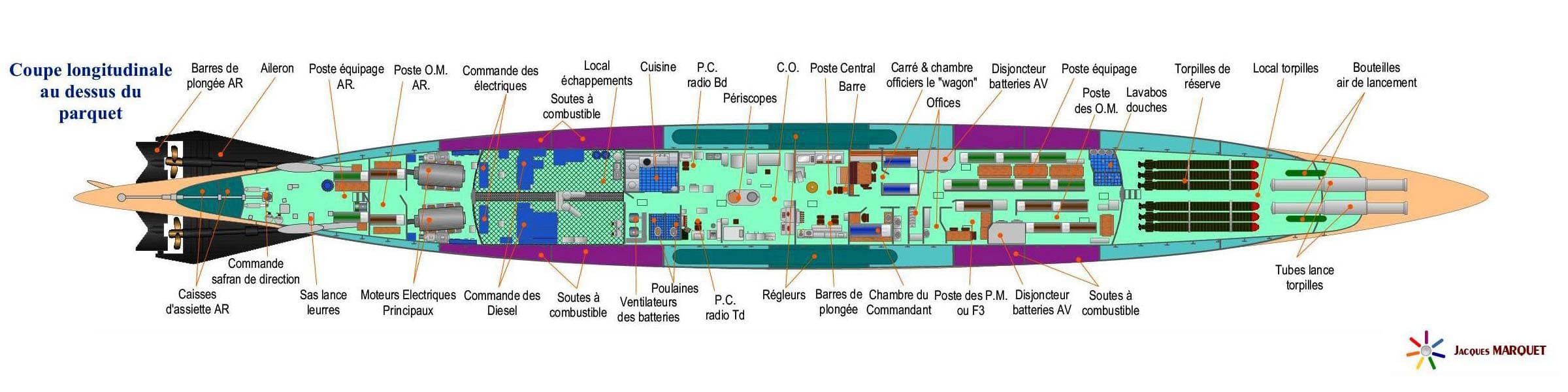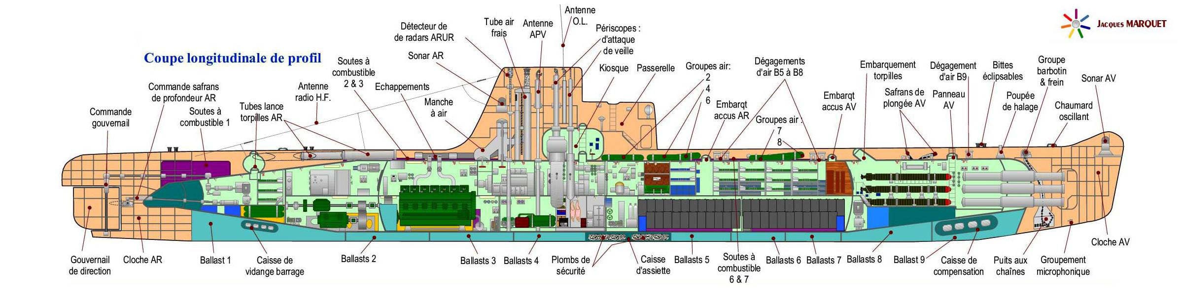 Je remercie Jacques MARQUET pour la réalisation de ces planches absolument remarquables de détails. Celles-ci facilitent grandement la compréhension de la constitution d'un sous-marin de type NARVAL.