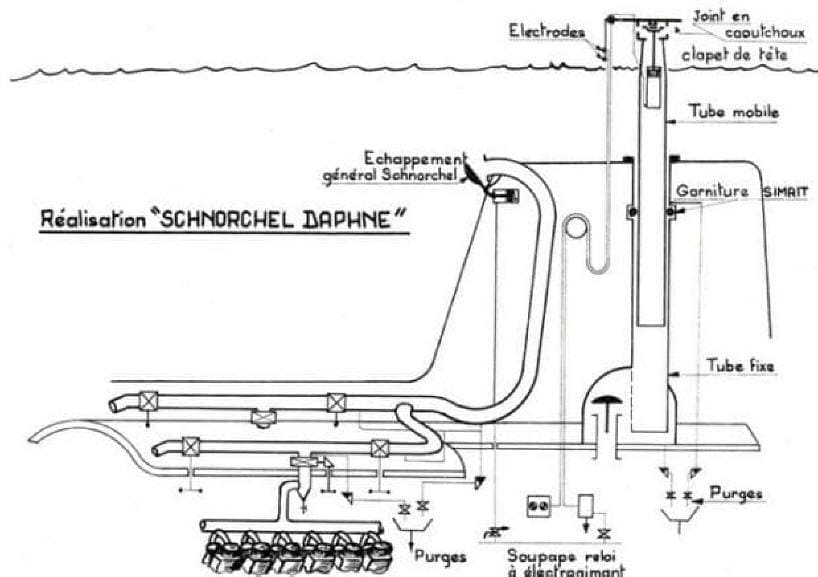 Sur les autres types de sous-marins les coupoles d'air sont munies d'une manche à air permettant de prendre l'air sans hisser le tube d'air comme sur les types Daphné. Mais le but principal d'un sous-marin est de rester invisible. Nous disposons donc sur tous types de sous marins d'un schnorchel afin de lancer la charge des batteries et renouveler l'air du bord en immersion périscopique. L'immersion est maintenue juste assez pour prendre l'air nécessaire aux diesels. Les électrodes permettent de fermer automatiquement le clapet de tête pour ne pas embarquer de l'eau à bord. En situation clapet fermé, les diesels tournent, aspirent l'air du bord et créent une dépression dont la limite d'alerte maxi est de 220 millibars. Les tympans des hommes d'équipage sont mis à rude épreuve. C'est pourquoi le barreur de plongée doit remonter rapidement (oui mais pas trop, c'est comme le Banga). Le bon barreur est celui qui fait fonctionner le clapet en permanence avec le tchiii !.. tchou !... caractéristique d'ouverture et de fermeture de clapet. Dans ce cas le tube d'air est sorti juste ce qu'il faut avec la discrétion maximum pour éviter la détection par un radar (avion, bâtiment de surface, etc...). On ne peut malheureusement pas réduire la taille du tube d'air frais à cause du débit d'air à fournir aux diesels. On cherche surtout à réduire l'intumescence produite par les gaz d'échappement en faisant aboutir le tube d'échappement le plus bas possible sous l'eau. Les diesels doivent être réglés pour échapper de la fumée incolore. La tête du schnorchel est parfois recouverte d'un revêtement antiradar.