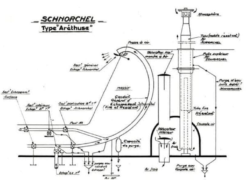 Sur les schémas suivants, Type NARVAL et ARÉTHUSE, apparaît un élément qui n'existe pas sur les type DAPHNÉ, la manche à air frais. Ceci permet de lancer les diesels en surface sans être obligé de hisser le tube d'air.